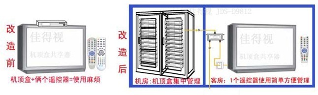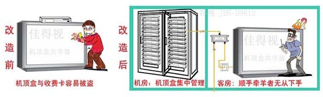 2、防盗:机顶盒分散在客房,卡容易被偷,改造后:集中放置在机房,安全不易损坏。